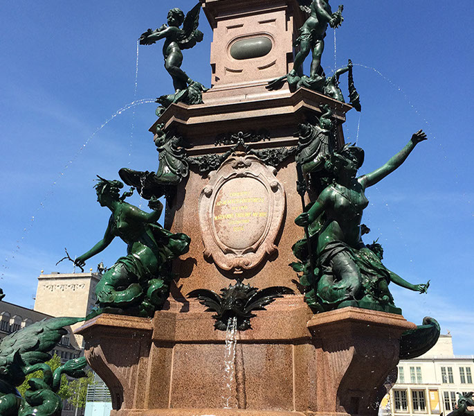 Die aufwendigen Restaurierungsarbeiten fielen hauptsächlich am oberen Brunnenbecken und mittigen Postament an. Wir übernahmen bei diesem Projekt auch die Restaurierung goldener Schriftzeichen.
