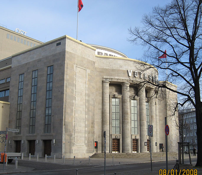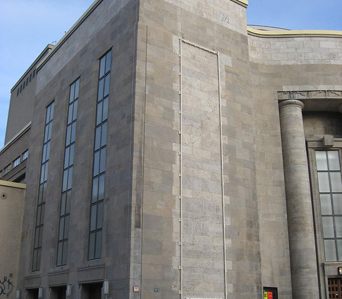 Für die fachgerechte Sanierung mußten konkave und konvexe Natursteinplatten versetzt werden. Die Stahlträger waren stark korrodiert und dadurch deutliche Schäden an der Muschelkalkfassade entstanden. Nach einer Hintergrundertüchtigung bauten wir die fünf oberen Natursteinreihen ab und verkleideten hier mit neuen Muschelkalkplatten annähernd an den Bestand erneut.